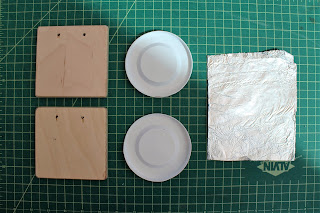 2. Align lids on wood panels and drill in a wood screw with washer on top — be sure the screw slightly pokes through the back of the wood panel.